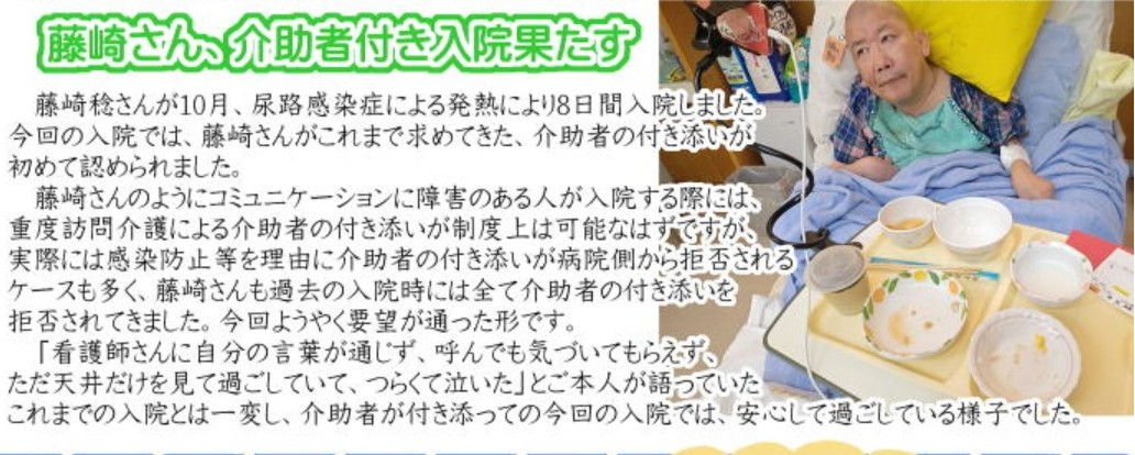 - *藤崎さん(わらじの会会長)、介助者付き入院果たす。――(NPOかがし座のHP)