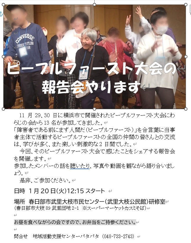 - *ピープルファースト大会で感じたことをシェアする報告会を開催します。――1月20日(火)12:15スタート。春日部市武里大枝市民センター(武里大枝公民館)研修室