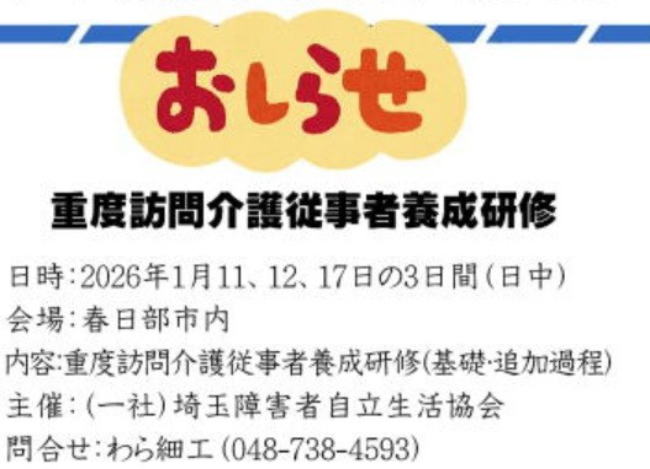 - *「重度訪問介護従事者養成研修」のお知らせ――・2026年1月11.12.17日、会場は春日部市内。主催:(一社)埼玉障害者自立生活協会